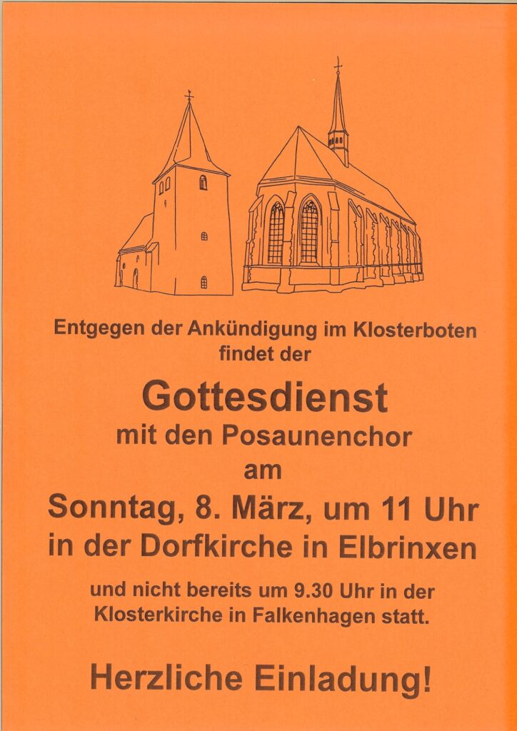 Entgegen der Ankündigung im Klosterboten findet der Gottesdienst der Ev.-ref. Kirchengemeinde Elbrinxen-Falkenhagen am kommenden Sonntag, 8. März, nicht wie im Klosterboten angekündigt um 9.30 Uhr in Falkenhagen, sondern um 11 Uhr in Elbrinxen in der Dorfkirche statt. Für die musikalische Begleitung sorgt der Posaunenchor. Herzliche Einladung!