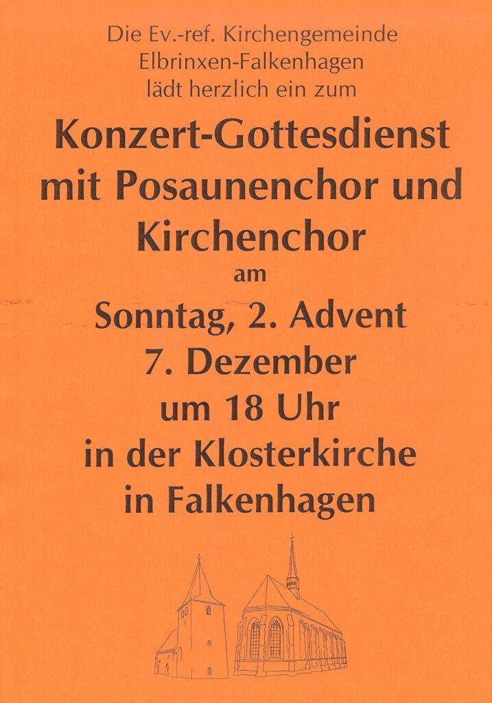 Die Ev.-ref. Kirchengemeinde Elbrinxen-Falkenhagen lädt herzlich ein zum Konzert-Gottesdienst mit dem Posaunenchor und dem Kirchenchor am Sonntag, 2. Advent, 7. Dezember, um 18 Uhr in der Klosterkirche in Falkenhagen. Im Anschluss sind alle Gottesdienstbesucher zu einem heißen Getränk und Snacks im Kreuzgang eingeladen.