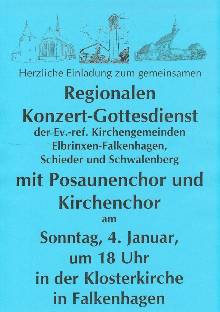 Die Ev.-ref. Kirchengemeinden Elbrinxen-Falkenhagen, Schieder und Schwalenberg laden herzlich ein zum ersten regionalen Gottesdienst im Jahr 2026. Die Konzert-Gottesdienst, der vom vereinigten Posaunenchor und dem Kirchenchor gestaltet wird, beginnt am Sonntag, 4. Januar 2026, um 18 Uhr in der Klosterkirche in Falkenhagen. Im Anschluss an den Konzert-Gottesdienst sind alle Besucher noch auf ein warmes Getränk im Kreuzgang eingeladen.